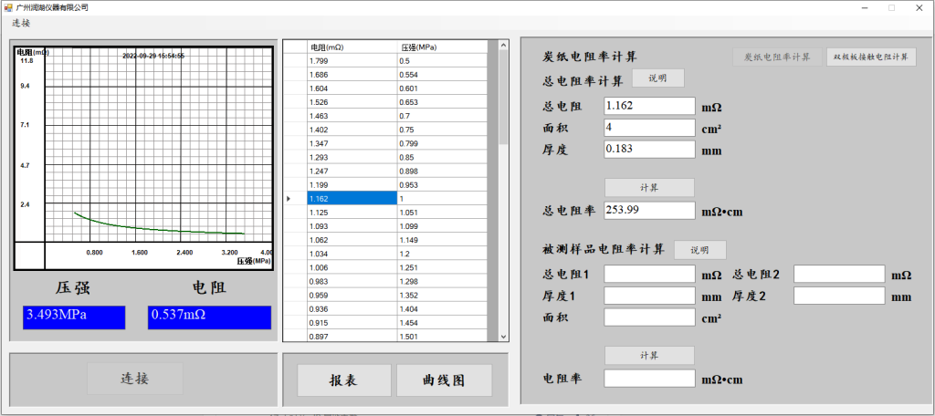 注:样品放置在两块电极之间,在电极两侧施加一定的压强,测试过程中仪器通过自动记录不同压强下的电流和电压值,得到不同施加压强下的电阻值。