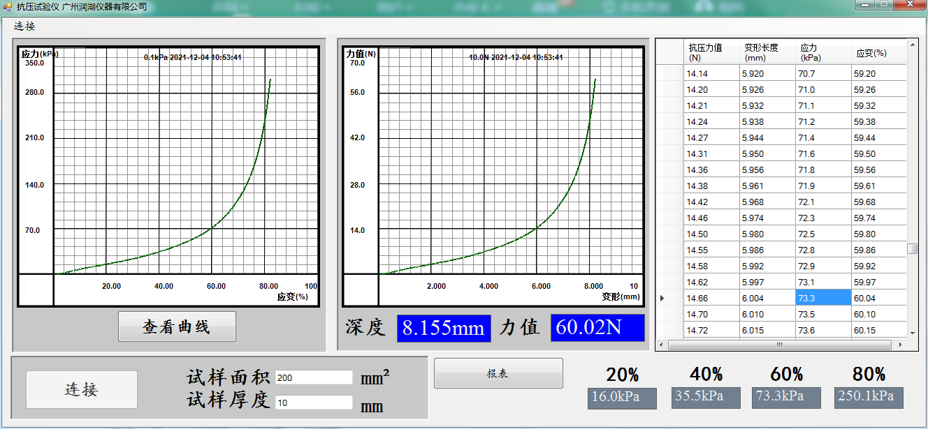 测试模式:设置固定压力或固定变形量测试到此压力或者变形量后测试结束,测试数据为测试过程中的所有厚度压力数据。