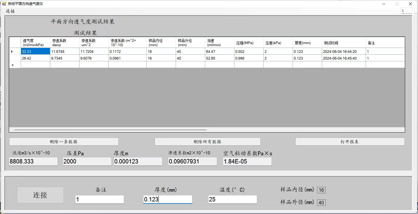 将一定面积试样(炭纸)平放在两刚性测试平面间,对试样垂直施加压力,测定在不同压力状态下,一定压差气体通过试样(平面方向)通气量并计算出样品的渗透系数。