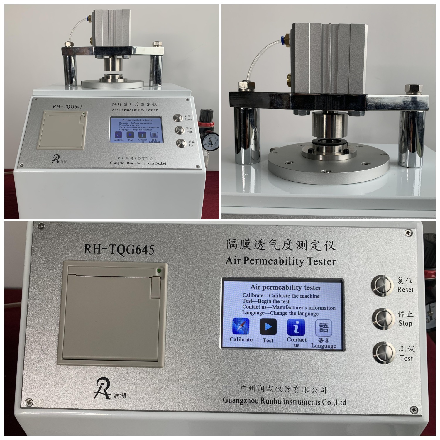 RH-TQG645 Diaphragm Air Permeability Tester is used for testing the air permeability of battery diaphragm, mica tape, breathable film, thin film, paper and other materials and related polymer products.