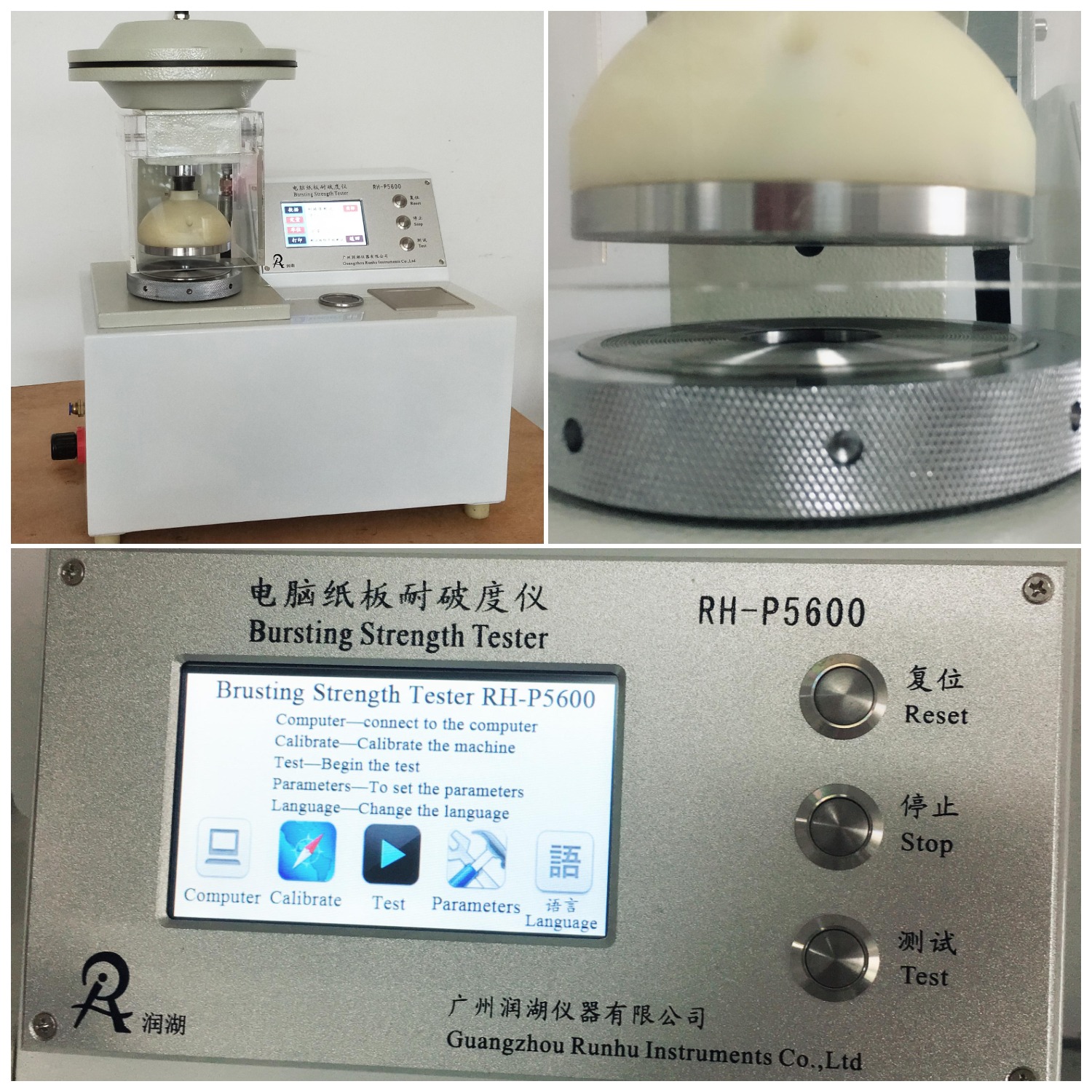 RH-P5600 Corrugated Board Bursting Strength Tester is the test instrument of the bursting strength of the paper and corrugated board (hereinafter referred to as the instrument).and it is the new instrument developed by our company according to the new national standard. The instrument adopts advanced components of domestic and foreign, matching components and a single chip microcomputer, that can make reasonable structure and functions design and it is with the various parameters including testing, conversion, adjustment, display, memory, printing and other functions as the standard. The performance parameters and technical indicators are in line with the ISO2759 The Board — Determination of Bursting Strength and GB1539 The Cardboard Bursting Determination of the standard. It is suitable for use in all kinds of paper and cardboard bursting strength test.