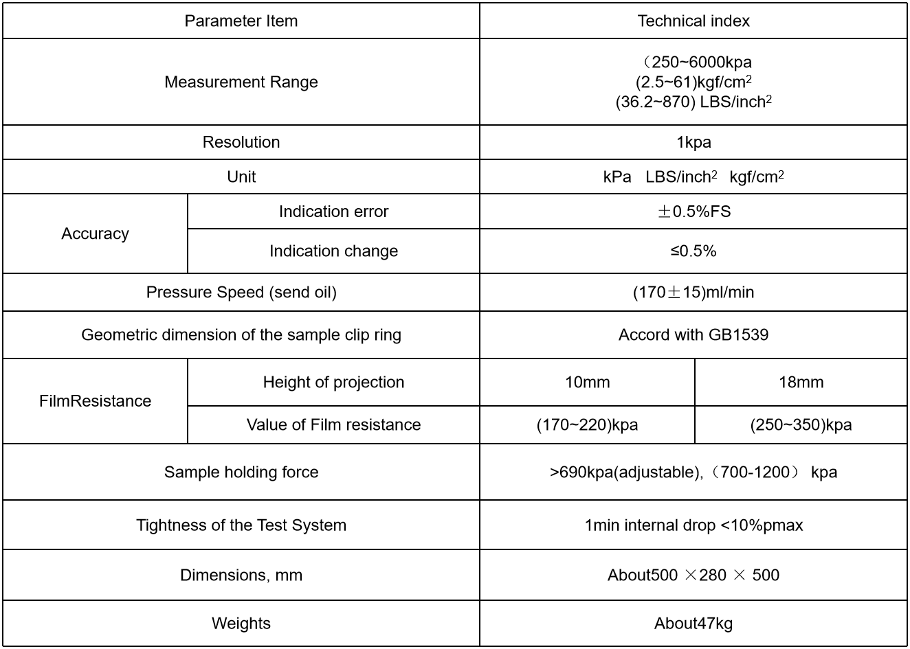 Liquid crystal display in English/Chinese, human-computer interface. Automatic test with statistical data handling. Using the micro printer, also can connect the computer operation. When it connected to a computer, it can automatically saves test results, also can display test curves of burst strength and save.